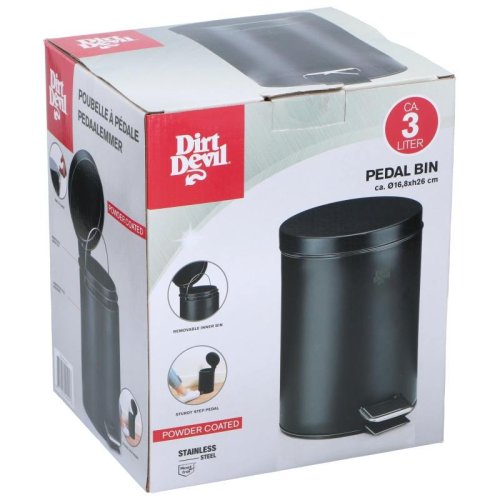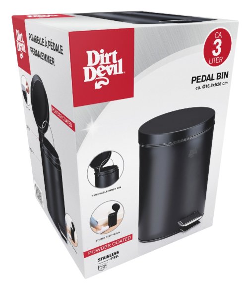Tento malý pedálový odpadkový koš od Dirt Devil o objemu 3 litry je ideálním doplňkem do vaší koupelny nebo toalety. Usnadňuje likvidaci drobných předmětů, které by se neměly splachovat do záchodu, jako jsou hygienické vložky, tampony nebo plenky. Malý 3litrový koš je vybaven vložkou koše, která usnadňuje výměnu koše a udržuje jej déle čistý.