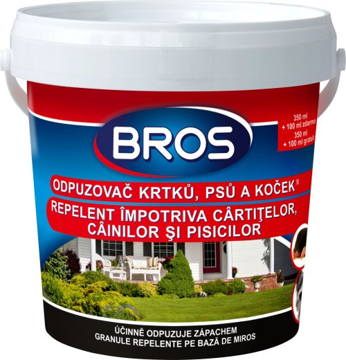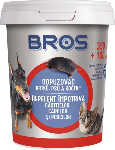 Odpuzovač krtků, psů a koček ve formě prášku zajišťuje dokonalou ochranu zahrad a dětských hřišť. Zápach účinně odpuzuje zvířata, ale není nepříjemný pro lidi. Za příznivých povětrnostních podmínek (málo srážek) si přípravek zachovává účinnost po dobu zhruba 2 měsíců. Návod k použití k odpuzení krtků: do krtčího tunelu nasypte několik polévkových lžic (5 polévkových lžic = 20 g produktu). Celou oblast lze ochránit tak, že aplikujete přípravek od středu postižené oblasti a obden budete chráněnou oblast rozšiřovat. K odpuzení koček a psů: naneste 2 polévkové lžíce na 1 m2. V místech se silnějším zatížením naneste větší množství přípravku. Balení: 350 ml + 100 ml zdarma.