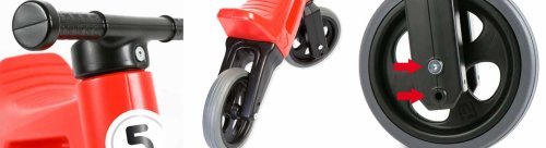 Odrážedlo koupíte sestavené jako tříkolové. Součástí balení jsou dva imbusy a kratší osa na zadní kolo pro úpravu odrážedla na dvoukolové. Je možné zakoupit i náhradní díly – samostatná kola a osy.