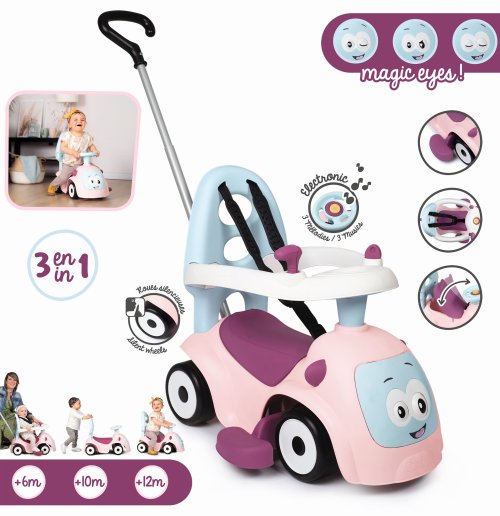 Odrážedlo pro nejmenší, které poroste s dítětem. Odnímatelné rodičovské madlo, snímatelný ochranný rám a bezpečností pás pro nejmenší děti. Volant se zvuky - 3 zvukové efekty, tichá kolečka, pohyblivá očíčka. Hmotnost: 3,555 kg. Rozměry: 61 x 55 x 44 cm.