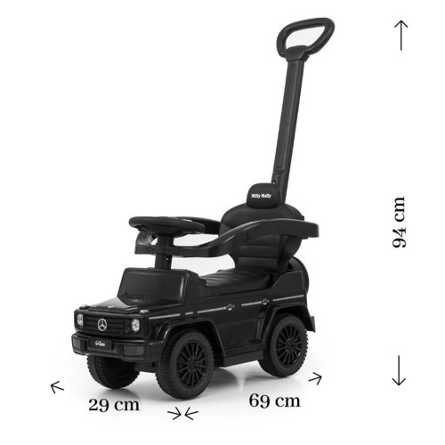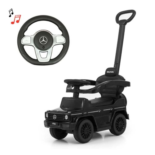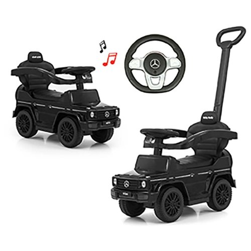 Dětské odrážedlo s vodící tyčí MERCEDES G350d je vyrobeno v licenci koncernu MERCEDES. Váš malý závodník či závodnice se v něm bude cítit jako v opravdovém džípu. Odrážedlo je vyrobeno s důrazem na každý detail a kvalitu použitých materiálů. Jeho vzhled upoutá pozornost nejen každého dítěte, ale i rodiče. Odrážedlo pomáhá rozvíjet motorické schopnosti dítěte a Váš malý závodník či závodnice si s ním užije spoustu zábavy a legrace. Autíčko má na tříramenném volantu tlačítka vydávající různé melodie, zvuk motoru nebo houkačku. Je určeno jak pro nejmenší děti, které už umí sedět, tak i pro děti, které se už naučily chodit. Odrážedlo má otočná přední kola, široké a komfortní sedadlo s úložným prostorem a pohodlnou a zároveň pevnou vodící tyč, kterou lze odrážedlo řídit. Vodící tyč, opěrky na ruce a podnožky lze sundat a tím dítě využije autíčko jako klasické odrážedlo. Baterie nejsou součástí balení (2x AA 1.5V).