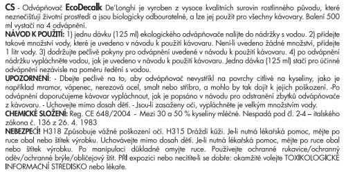 Eco Decalk je nový odvápňovací prostředek De´Longhi Složení je navrženo tak, aby byl 100% ekologicky nezávadný a zároveň ještě účinnější v boji proti vodnímu kameni uvnitř kávovarů Vyroben z přírodních …