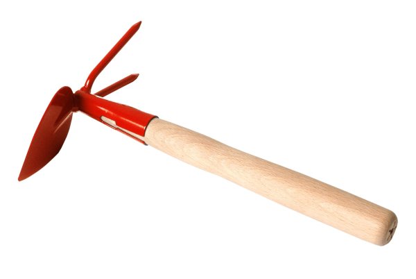 Okopávačka ve tvaru srdíčka se dvěma hroty pro kypření půdy na záhonech, pracovní část z kovu, násada dřevěná.