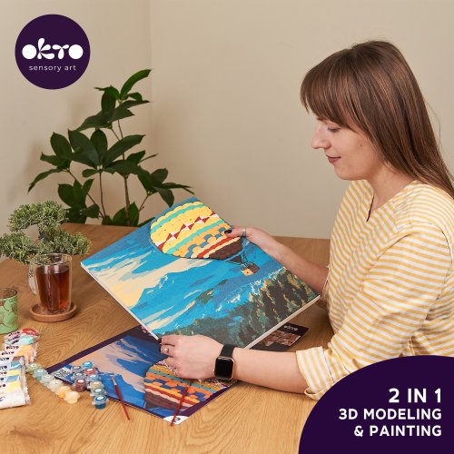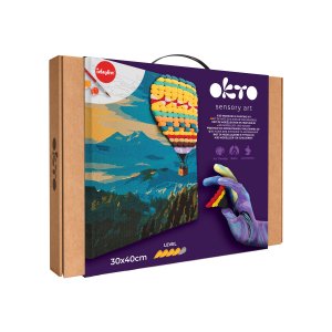 OKTO Malba a 3D modelování obraz "Hot Air Balloon Flight". Velikost plátna 30x40 cm. Vymalujte obrázek podle čísel a vytvarujte 3D prvek obrazu. Obtížnost 4/5. Obsah balení - plátno, obrázkový návod, modelovací nástroj, sada samoschnoucí modelovací hmoty, set barev na malování, štětec.