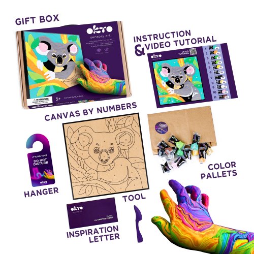 OKTO Malování hmotou podle čísel "Koala". Velikost plátna 29x29 cm. Vytvarujte obrázek podle čísel. Obsah balení - plátno, obrázkový návod, modelovací nástroj, sada barevných tvarovacích směsí 14 ks.