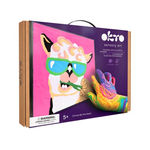 OKTO Malování hmotou podle čísel "Lama". Velikost plátna 29x29 cm. Obsah balení - plátno, obrázkový návod, modelovací nástroj, sada barevých tvarovacích směsí 14 ks.