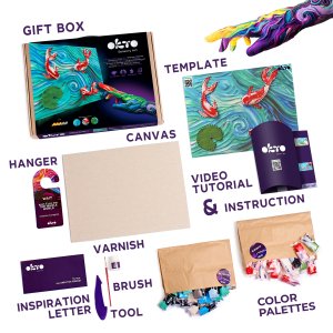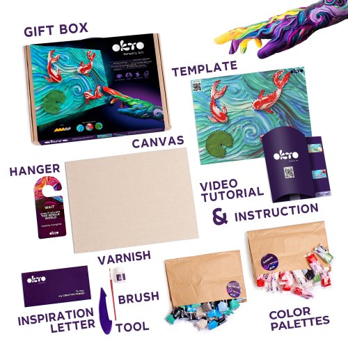 OKTO SENSOTY ART výtvarná sada ”Kapři koi”. Velikost plátna 30x40cm. Obsah balení: přírodní plátno, návod, dřevěný tvarovací nástroj, sada modelovacích hmot, akrylový (ve vodě rzpustitelný) lak 20 ml, štětec.