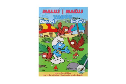 Omalovánka A5 Maluj vodou má obálku s lesklou povrchovou úpravou a 8 obrázků k vykreslení. K vybavení obrázků stačí jen voda a štětec. V obrázcích jsou barevné tečky, které po rozetření vodou obrázek vybarví.