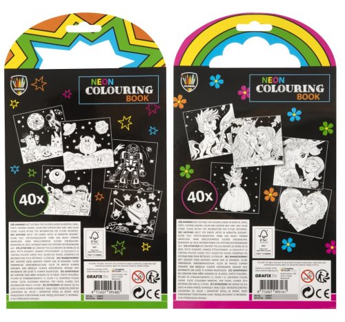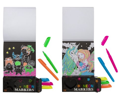 Sada omalovánek – dva druhy. Sada obsahuje 40 ks listů s obrázky + 5 fixů v neonových barvách.