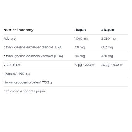 OMEGA-3 PLUS COMPRESSED CAPS představuje prémiovou formu rybího oleje, obohacenou o vitamin D. Rybí olej je uzavřen ve speciálních softgelových kapslích, které výrazně zpomalují degradační procesy účinných látek a tím zvyšují přirozenou trvanlivost a stabilitu výrobku. Produkt OMEGA 3 SOFTGEL CAPS obsahuje rybí olej získaný výhradně z ančoviček – ryb odchycených v Peruánském (Humboldtově) proudu, který je celosvětově považován za nejproduktivnější mořský ekosystém. Rybí olej v softgelových kapslích je obsažen výhradně ve formě využitelných triglyceridů. Omega-3 nenasycené mastné kyseliny jsou vysoce koncentrované a v každé kapsli je obsaženo 301 mg mastné kyseliny eikosapentaenové (EPA) a 210 mg mastné kyseliny dokosahexaenové (DHA). Uvedené omega 3 mastné kyseliny pozitivně podporují mozkovou činnost, udržují srdeční funkce a podporují zrak. Příznivých účinků je dosaženo při denním příjmu 250 mg EPA a DHA.