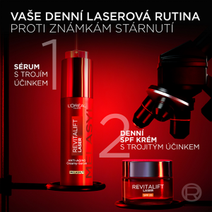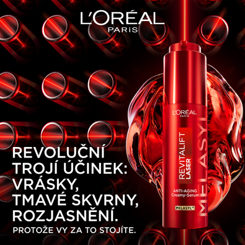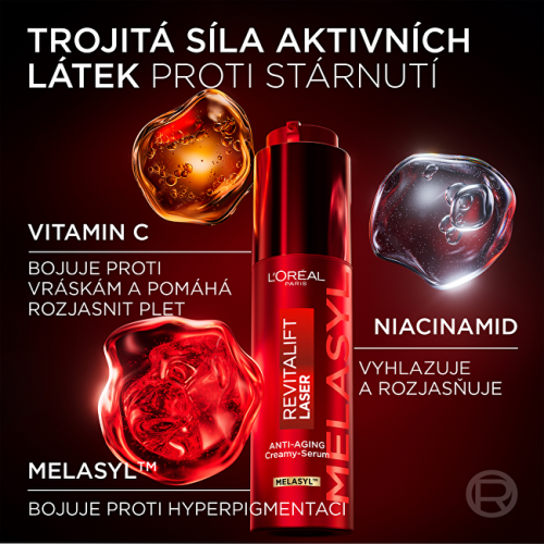 Omlazující krémové sérum Revitalift Laser s obsahem patentované látky Melasyl™ účinně redukuje hluboké vrásky, rozjasňuje pleť a působí proti tmavým skvrnám. Pokročilé složení se zaměřuje na korekci pigmentových nedokonalostí a sjednocení tónu pleti. Spojením inovativní technologie a silných aktivních látek vznikl produkt s viditelným účinkem již během krátké doby používání.