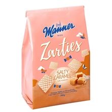 Křupavé oplatky Manner Zarties s krémovou náplní s příchutí slaného karamelu (67%) Oplatky Manner se skládají z pěti vrstev jemných vaflí plněných čtyřmi vrstvami nejjemnější krémové náplně, jejich velikost …