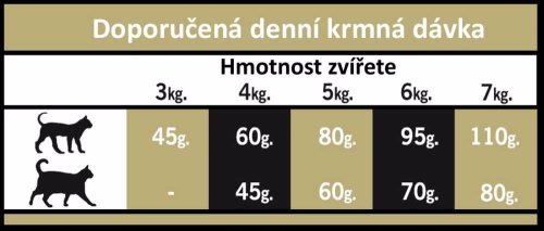 Analytické složky: Hrubý protein 32 %, hrubý olej a tuky 16 %, mastné kyseliny omega 6: 3 %, mastné kyseliny omega 3: 0,6 %, hrubá vláknina 3 %, celková dietní vláknina 7 %, hrubý popel 7 %, vápník 1,1 %, fosfor 1 %, vlhkost 9 %.
