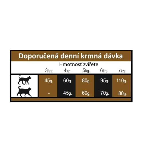 Analytické složky: Hrubý protein 31 %, hrubý olej a tuky 17 %, mastné kyseliny omega 6: 3,3 %, mastné kyseliny omega 3: 0,35 %, hrubá vláknina 3,5 %, celková dietní vláknina 6,5 %, hrubý popel 7,5 %, vápník 1,3 %, fosfor 1,15 %.