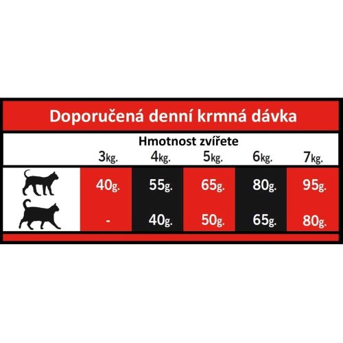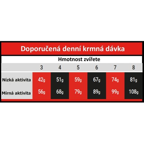 Analytické složky: Hrubý protein 30 %, hrubý olej a tuky 13 %, mastné kyseliny omega 6: 3 %, mastné kyseliny omega 3: 0,25 %, hrubá vláknina 3 %, hrubý popel 7 %, vápník 1 %, fosfor 0,9 %, energie 3730 kcal/kg.