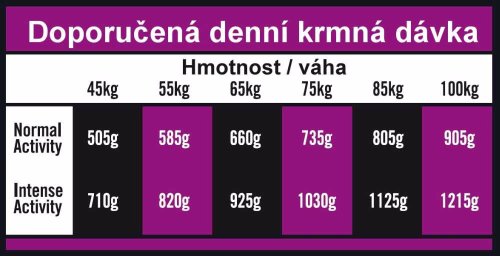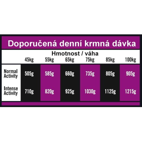 Analytické složky: Hrubý protein 27 %, hrubý olej a tuky 18 %, mastné kyseliny omega 3: 0,45 %, mastné kyseliny omega 6: 3,90 %, EPA+DHA 960 mg / kg, hrubá vláknina 2,50 %, hrubý popel 8 %, vápník 1,60 %, fosfor 1,30 %.