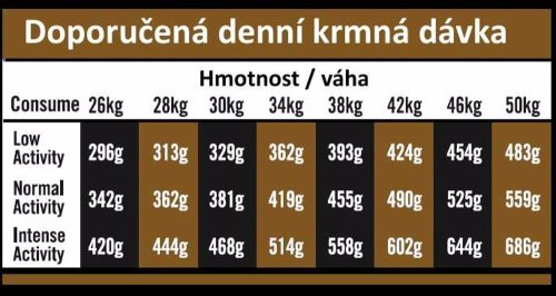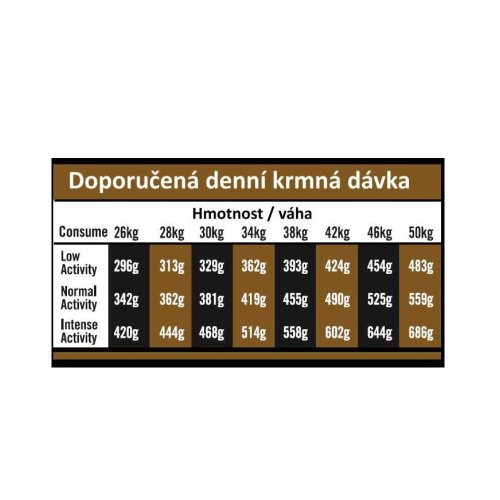 Analytické složky: Hrubý protein 25 %, hrubý olej a tuky 16 %, mastné kyseliny omega 3: 0,40 %, mastné kyseliny omega 6: 3,60 %, EPA+DHA 920 mg / kg, hrubá vláknina 3,25 %, hrubý popel 8 %, vápník 1,35 %, fosfor 1,05 %.