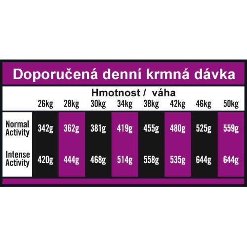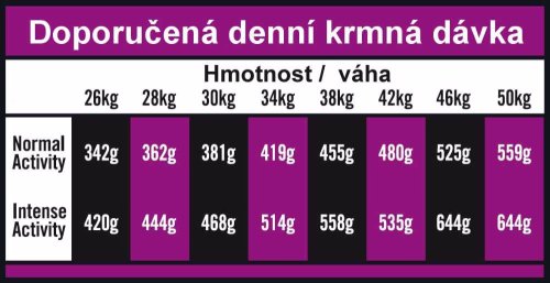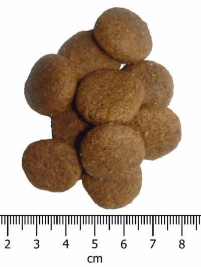 Analytické složky: Hrubý protein 25 %, hrubý olej a tuky 16 %, mastné kyseliny omega 6: 3,60 %, EPA+DHA 920 mg / kg, hrubá vláknina 2,75 %, hrubý popel 8 %, vápník 1,35 %, fosfor 1,05 %.