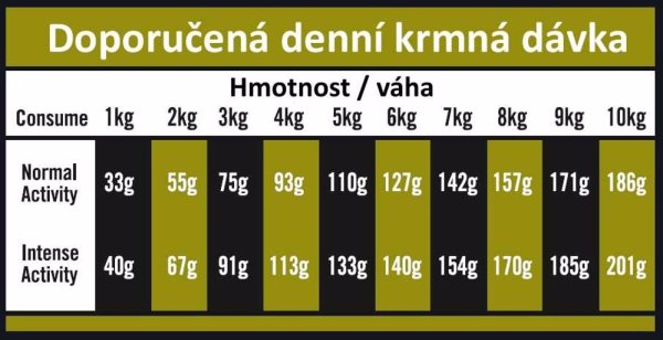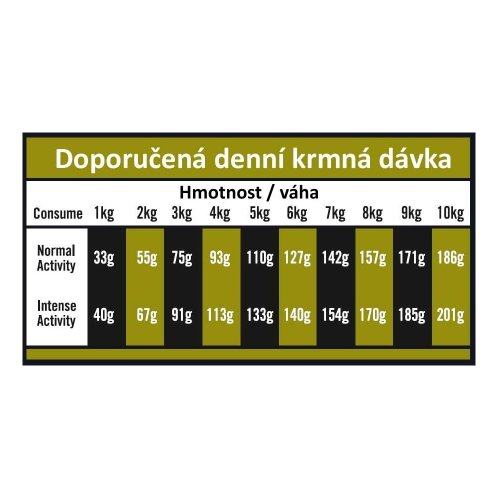 Analytické složky: hrubý protein 30 %, hrubý olej a tuky 18 %, EPA+DHA 400 mg / kg, Omega-3 mastné kyseliny 0,50 %, Omega-6 mastné kyseliny 1,45 %, hrubá vláknina 3,0 %, hrubý popel 7,5 %, vápník 1,0 %, fosfor 0,80 %. Metabolizovatelná energie: 3 947 kcal/kg.
