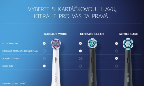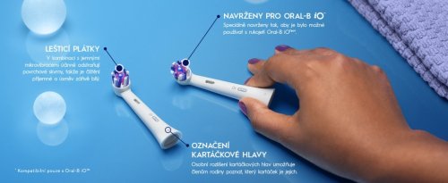 4 kartáčkové hlavy Oral-B iO Radiant White v balení Kombinuje kulatou kartáčkovou hlavu inspirovanou zubními lékaři s lešticími prvky, které šetrně odstraňují povrchové skvrny, takže jsou zuby bělejší už od prvního dne. Zubní lékaři doporučují vyměňovat kartáčkovou hlavu každé 3 měsíce, aby byla zachována optimální účinnost čištění