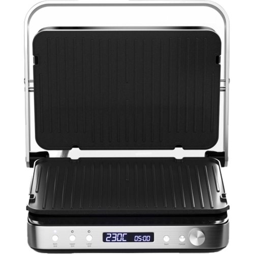 Výkonný elektrický stolní kontaktní gril Funkce otevřeného i kontaktního grilu Samostatně regulovatelná teplota (každá plocha samostatně) Kombinace 2 grilovacích ploch (hladký a žebrovaný povrch) Variabilní nastavení teploty 80 až 230 ° C Grilovací desky s nepřilnavou vrstvou Časovač s automatickým vypnutím Velký LCD displej Zvuková signalizace Tepelně izolovaná rukojeť Miska na odkapávání šťávy a oleje Snadné čištění Odnímatelné grilovací desky Protiskluzové gumové nožičky pro větší stabilitu