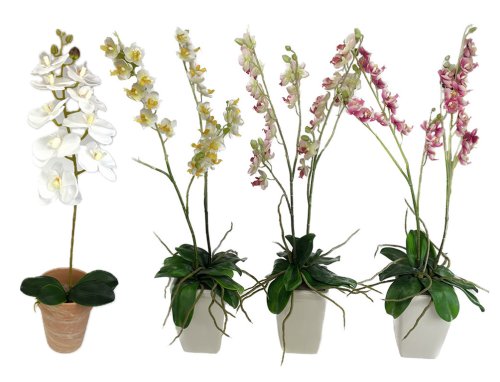Umělá květina imitující orchidej. Obsahuje dva výhony s květy této květiny v květináči. Materiál: textilie, plast. Velikost: 65 cm. Barva: mix barev bílo-žlutá, bílo-růžová, růžovo-bílá.