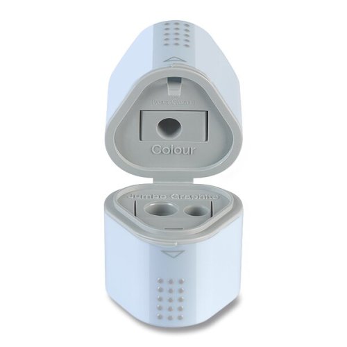 trojité ořezávátko vhodné pro standardní trojhranné tužky i pastelky a silné typu Jumbo, * uzavíratelné, * velká nádobka na odřezky na obou stranách