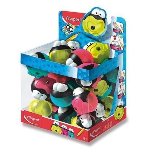 Plastové ořezávátko Maped Croc Croc signal s patentovaným indikátorem ostrosti tuhy. Když je tužka dostatečně ořezaná, na vrchu ořezávátka se objeví oči. Včetně zásobníku na odpad. Mix barev.