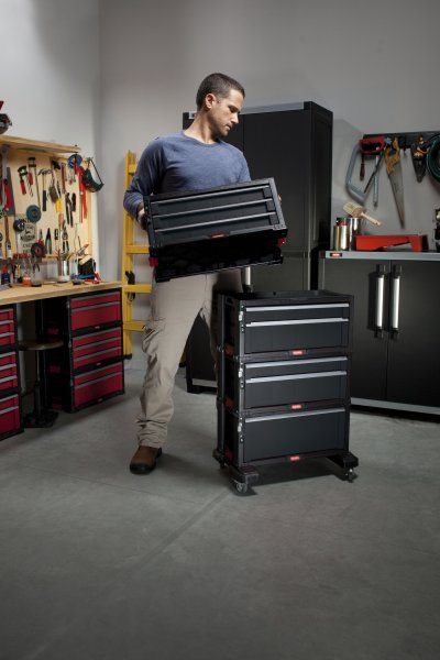 Na stranách boxu najdete rukojeti pro pohodlné přenášení. Ať už si ho chcete naložit do auta, vzít si ho na zahradu nebo uklidit do dílny, manipulace s ním je jednoduchá. Organizér je vybavený jednou prostornou zásuvkou, do které uložíte nářadí či jiné pomůcky. Máte je vždy po ruce a připravené k použití.