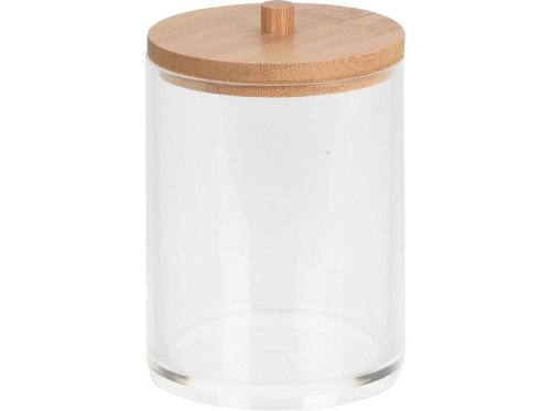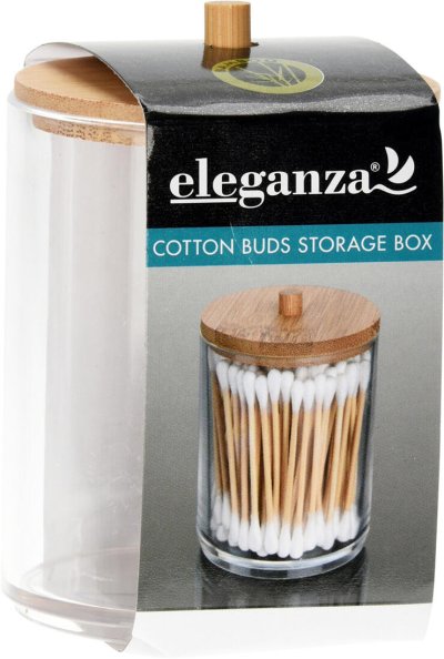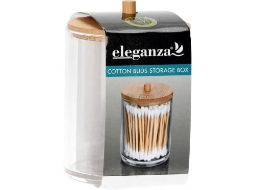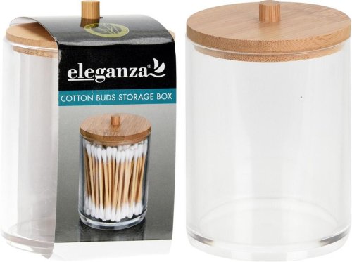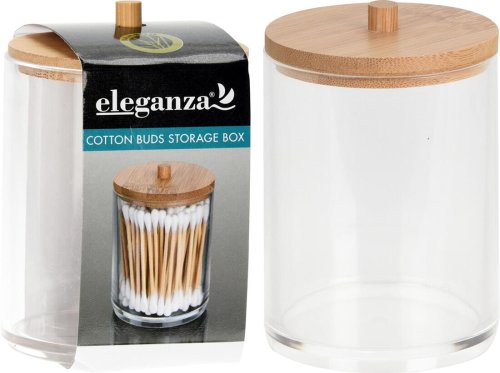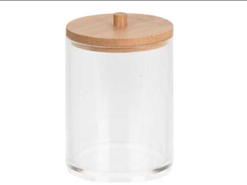 Transparentní zásobník na vatové tyčinky s bambusovým víčkem se hodí do každé koupelny či na kosmetický stolek.