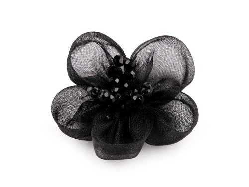 Romantický organzový květ s jemným třpytem je ve středu dozdobený propracovanými pestíky z broušených korálků. Díky nim se nádherně leskne. Květ má široké možnosti využití, působí nadýchaným vzhledem. Ve spodní části má textilní kolečko, pomocí kterého jej pohodlně kamkoliv upevníte. Dá se našít i nalepit. Použití: Květ můžete našít jako ozdobu na společenské šaty, halenky, trička nebo svetry. Je vhodný i na zdobení klobouků, čepic a čelenek do vlasů. Můžete ho také pomocí lepidla přilepit na brožový můstek a vytvořit zajímavý šperk.