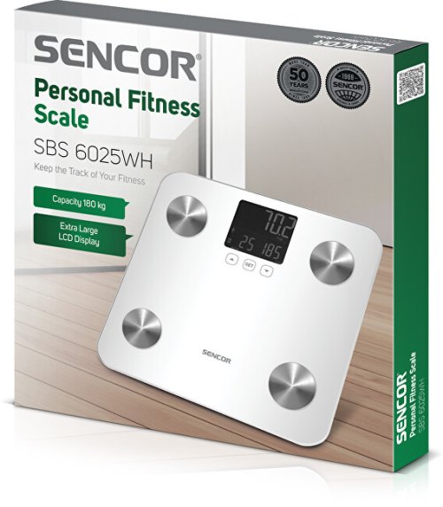 Osobní fitness váha Sencor SBS 6025WH vám poskytne rychlý a přesný přehled o vašem tělesném složení. Kromě klasického vážení umí analyzovat i podíl tělesného tuku, vody, svalové hmoty, kostí a spočítá také BMI. Ovládání je jednoduché díky dotykovým tlačítkům a velkému přehlednému LCD displeji s podsvícením. Elegantní design se skleněnou vážící plochou v kombinaci s nerezovými prvky zapadne do jakéhokoli interiéru a zároveň usnadňuje údržbu. Váha rozpozná uživatele automaticky a nabízí paměť až pro 12 osob, včetně speciálního režimu pro aktivní sportovce. Disponuje funkcí Auto-On, která umožňuje vážení ihned po nášlapu, a volbou jednotek mezi kg, lb nebo st. Je vybavena indikací slabé baterie a přetížení, a také se sama vypne při nečinnosti. Maximální nosnost činí 180 kg s přesností na 100 g. Napájena je třemi AAA bateriemi a její rozměry jsou 30,2 × 30,2 × 2,3 cm. Bílá barva podtrhuje čistý moderní vzhled.