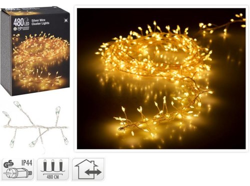 délka: 4,8 m přívodní kabel: 5 m osvětlení: 480 LED materiál: stříbrný drát vnitřní / venkovní použití