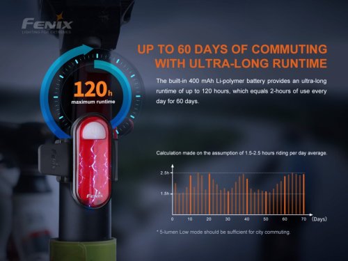 Nabíjecí červená blikačka Fenix BC05R V2.0 přináší dva stupně výkonu - 5 a 15 lumenů. V obou stupních výkonu má funkci rychlého blikání, pomalého blikání a konstantního svícení.. K napájení slouží zabudovaný lithium-polymerový akumulátor o kapacitě 400 mAh, který se nabíjí přes konektor typu USB-C přímo ve svítilně. Světelným zdrojem je pět červených LED, které jsou ukryté pod mírně vypouklou optikou, která vytváří široký světelný kužel viditelný až pod úhlem 180 stupňů. Účinná výstražná vzdálenost blikačky je 50 metrů, ale světlo je viditelné až ze vzdálenosti 230 metrů. Hmotnost svítilny je zanedbatelných 28 gramů. Součástí balení je i spona, díky které je možné svítilnu připnout na batoh, oblečení či na popruh čelovky. Je proto možné ji použít nejen jako zadní cyklosvětlo, ale i jako bezpečnostní červené světlo při běhání a turistice.