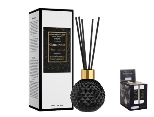 Prémiový osvěžovač vzduchu s odpařovacími tyčinkami. Zabalen ve velmi dekorativním, skleněném flakonu se zlatou zátkou. Doplňuje ji stylová krabička. Díky nim bude produkt luxusním dárkem. Odpařovací tyčinky jsou v černé barvě. Difuzér s názvem hematit snoubí voňavé tóny citrónu, růžového pepře, jasmínu, pačuli, vetiver a bílé pižmo. Objem: 100 ml. Barva: černá.