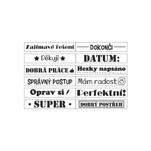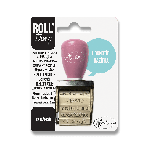 Razítko Roll' Stamp pro paní učitelky a pány učitele s 12 českými nápisy, které ušetří čas při kontrole úkolů, písemek i slohových prací. Funguje jako klasická datumovka, nápis se nastaví otočným pohybem a razítko se namočí do razítkovacího polštářku – doporučujeme rychleschnoucí razítkovací polštářky Aladine Izink Quick Dry. Rozměry jednotlivých razítkovacích ploch jsou 28 x 6 mm.