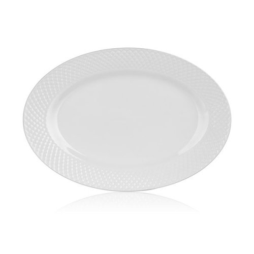 Oválný talíř Banquet Diamond Line v bílé barvě se zdobným reliéfem Vyrobeno z keramiky, rozměry 34,5 x 24,2 cm Lze použít do mikrovlnné trouby i do myčky na nádobí na běžné domácí použití
