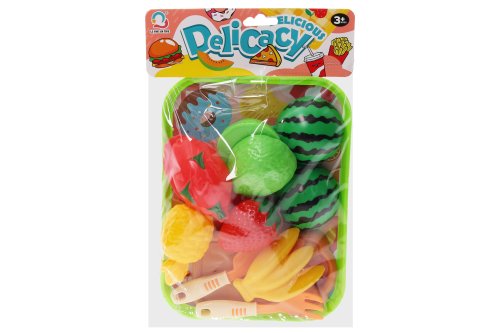 Krájecí ovoce set. Rozměry tácu 22x16 cm. Součástí potraviny, nůž, vidlička, krájecí prkénko, tác.