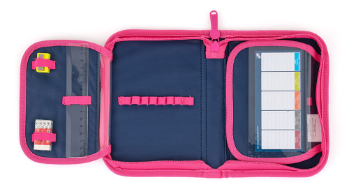 jednopatrový školní penál se dvěma chlopněmi bez náplně gumová poutka k uchycení psacích potřeb na vnitřní chlopni je průhledná fólie pro rozvrh hodin