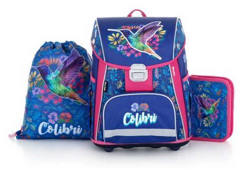 Školní set pro prvňáčka s motivem Kolibříka. Set obsahuje školní batoh Premium, pytlík na cvičky a nenaplněný jednopatrový penál. Aktovka:
