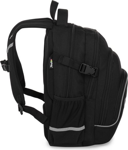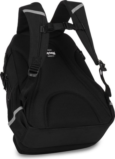 Školní batoh se třemi hlavními komorami a přední menší kapsou je opatřen pevnými zipy. Batoh má v zadní komoře polstrovanou kapsu na notebook a malou kapsičku. V přední komoře se nachází odnímatelný kroužek na klíče a pokročilý organizér pro uložení mobilního telefonu, peněženky, psacích potřeb a jiných drobností. Na bocích jsou dvě volně přístupné kapsy na láhev.