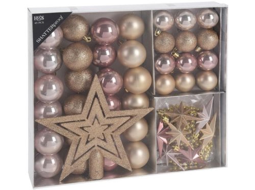 Vánoční ozdoby (koule, špička, dekorace), sada 45díl., stříbrné, zlaté, hnědé. sada obsahuje: - hvězda 19 cm (1 ks) - hvězdičky mix 5 x 8 cm (7 ks) - koule mix pr. 4 cm (12 ks) - koule mix pr. 5 cm (24 …