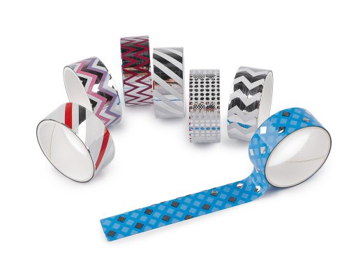 Sada lepicích pásek, které jsou ozdobené lesklými metalickými detaily. Využijete je na všech hladkých materiálech, jako je dřevo, plast, papír, sklo, atd. Můžete s nimi ozdobit dárky a krabičky či je nalepit na přáníčka, alba, fotorámečky, do diáře apod. Díky samolepicí vrstvě je velmi snadno použitelná, je pevná, nedá se trhat. Sada obsahuje 7 ks pásek s různým designem. Každý kotouček obsahuje cca 1,7 m pásky. Velké balení 24 ks pásek je zabalené v papírové krabičce s transparentním víkem. [Krabička má rozměry 12 x 16,5 x 4 cm.]