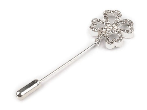 Ozdobný špendlík se čtyřlístkem bude dárkem, který potěší, protože čtyřlístek je symbolem štěstí. Spona se nosí jako elegantní ozdoba ke kostýmku. Je krásná v dámské i pánské klopě nebo v klobouku. Hodí se jako brož k halence. Díky ní si můžete ozdobně sepnout šátek. Čtyřlístek je vykládaný drobnými broušenými kamínky, které se oslnivě třpytí. Špendlík má na konci chránič proti popíchání nebo vyvlečení. Náš tip: špendlíkem můžete přichytit organzu nebo jinou dekorační látku, která se používá na slavnostní tabule, či potahy na židle. [Upozorňujeme zákazníky, že špendlíky mohou mít různou délku a mohou mít i lehké odbarvení kovového chrániče.]