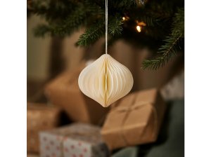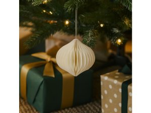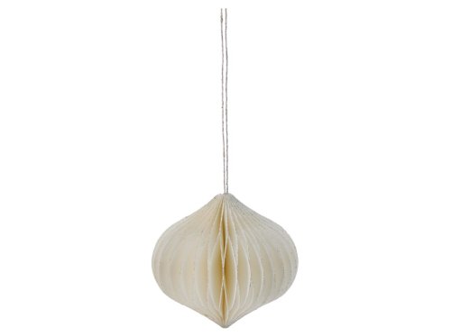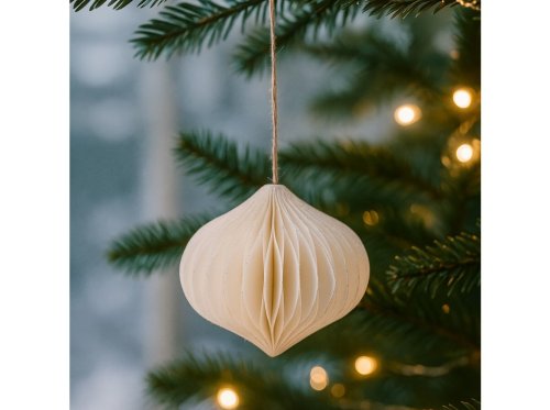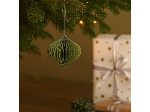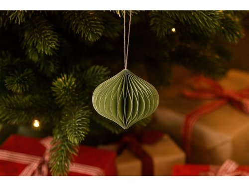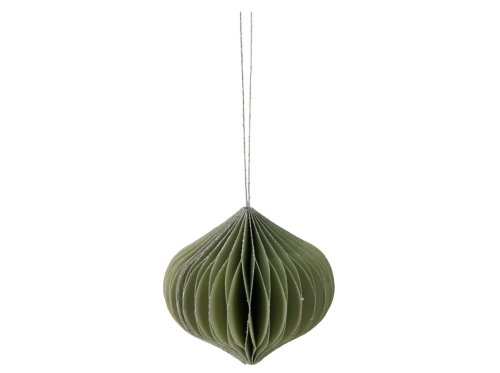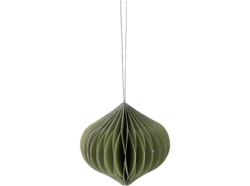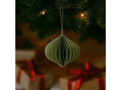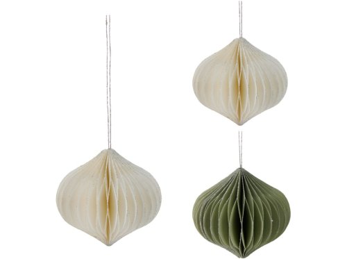 Papírové ozdoby o průměru 80 mm ve tvaru cibule s vánočními motivy v zelené a bílé barvě, doplněné stříbrným glitrem. Jednotlivé kusy jsou dodávány v mixu barev a motivů, které se mohou mírně lišit.