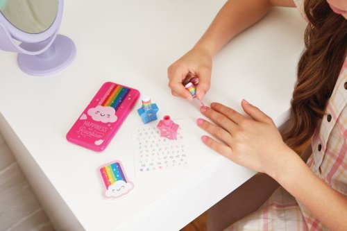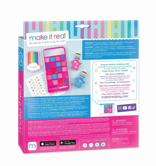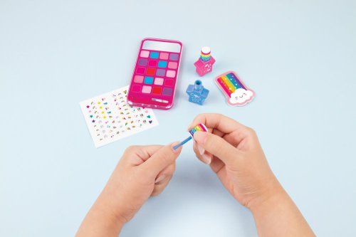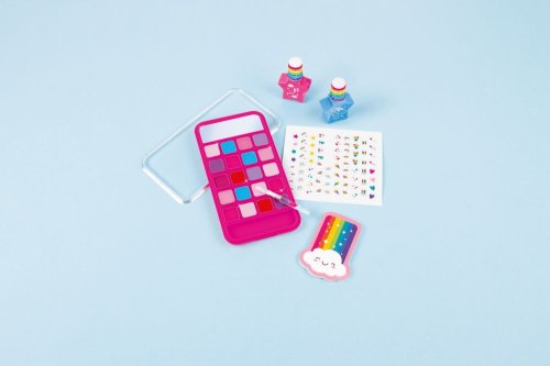 Paletka lesků na rty ve tvaru mobilního telefonu. Třpytivé aplikace, které můžete použít k tomu, abyste byly šik. Set obsahuje: 1 paletku lesků na rty s aplikátorem, 2 laky na nehty, 1 pilník na nehty a 1 arch samolepek na nehty. Baleno v krabici. Vhodné pro děti od 8 let. Laky na nehty jsou na vodní bázi a lze je odstranit jemným třením teplou vodou a mýdlem.