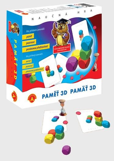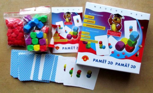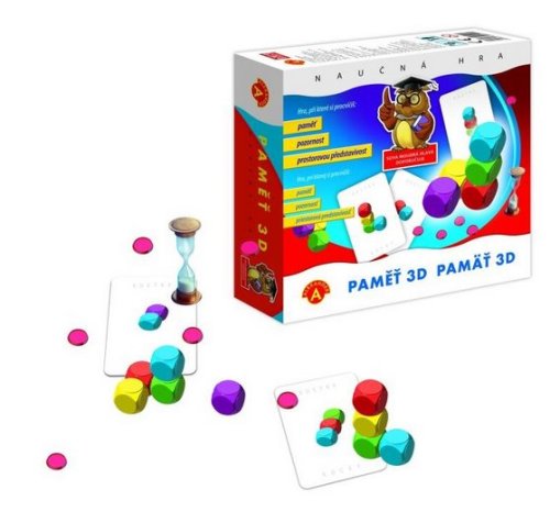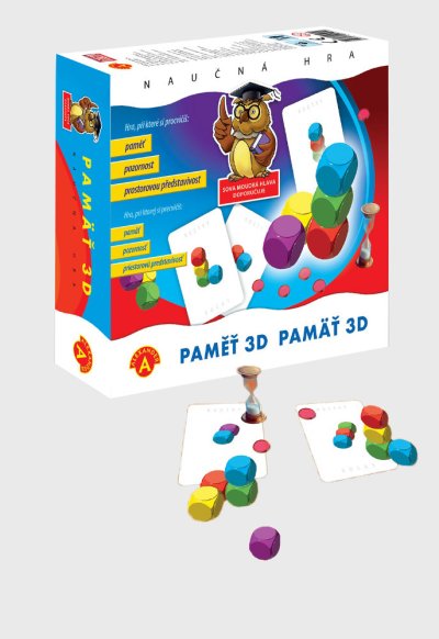 Naučná hra plná zábavy s barvami, prostorem a pamětí pro děti od 5 do 12 let a pro jejich rodiče (2-5 hráčů). Vyzkoušejte a trénujte svou prostorovou orientaci a zrakovou percepci, která je důležitá pro poznávání okolního světa a pro dobré zvládnutí učení písmen a znaků ve škole. Při hře si její účastníci také osvěžují poznávání barev a opakují počítání. Vhod přijde také procvičení paměti. Napětí jednotlivým kolům dodávají přesýpací hodiny, které určují čas na složení prostorového vzoru. Pro nejmladší hráče, můžete měření času vynechat a usnadnit jim tak hru. Úkolem hráče je zpaměti poskládat kostky do prostoru, podle vzoru na kartě, kterou si vytáhne z balíčku. Čas na položení odměřují přesýpací hodiny. Ten, kdo nejrychleji uloží kostky podle zapamatovaného vzoru, získává žeton. Vyhrává ten hráč, který má na konci hry nejvíce žetonů. Zvolte si OBTÍŽNOST: Poskládat barevné kostičky do prostoru nemusí být snadné, jak se na první pohled zdá. Proto hra umožňuje zvolit karty podle různé obtížnosti a přizpůsobit jí věku hráčů zapojených do hry. Z hraní hry Paměť 3D se tak pokaždé stane skutečná zábava.Pokud jste starší nebo dospělí, můžete si zvolit kartu se složitějšími vzory. Uvidíte jak jste na tom s prostorovým vnímáními svým pamatovákem! :-) Velikost kostek je 1,8 cm. Balení obsahuje: barevné kostky v 5 barvách– 25 kskarty vzorů – 55 kspřesýpací hodiny – 1 ksžetony – 100 ksčeský a slovenský návod – 1ks Hlavní vlastnosti: trénuje postřeh a paměťučí barvy a prostorovou představivost Dokumentace: návod ke hře CZnávod ke hře SK