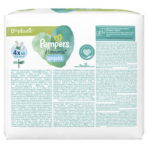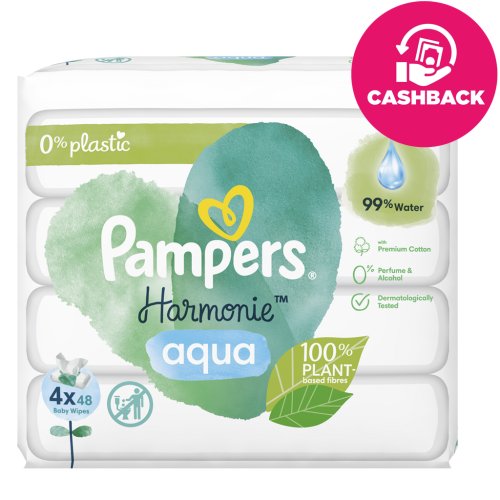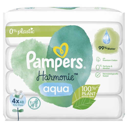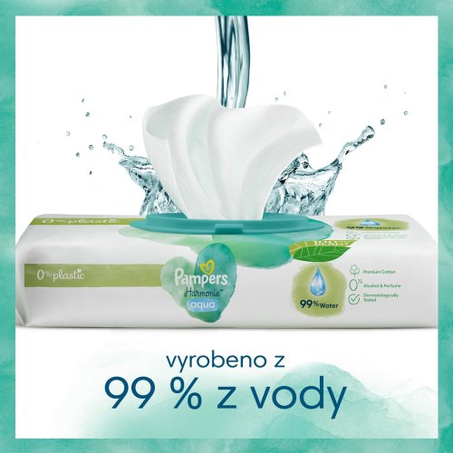 Pokožka novorozenců je velmi citlivá a zaslouží si šetrnou ochranu již při výměně plenky. Dětské čisticí ubrousky Pampers Harmonie Aqua obsahují 99 % vody pro úplnou ochranu pokožky. Obsahují 0 % plastů a jsou vyrobené z prémiové bavlny: 100% rostlinná vlákna. Jedinečné složení je dermatologicky testované a chrání pokožku lépe než vodou navlhčená bavlněná látka, aby jemně čistily i tu nejcitlivější pokožku a chránily ji před podrážděním. Protože jsou čisticí ubrousky Pampers Harmonie Aqua navržené s ohledem na citlivou pokožku novorozenců, jsou bez alkoholu, parfemace a barviv.