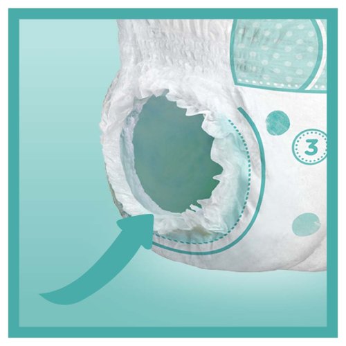 Jsou pohodlné v každém směru díky (1) pružnému pasu po celém obvodu, který se přizpůsobuje bříšku vašeho děťátka, (2) super absorpčnímu jádru, které rychle odvádí vlhkost a (3) pevnějším manžetkám kolem nožiček, které pomáhají předcházet protékání.