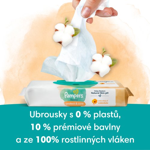 Šetrná péče a ochrana citlivé pokožky vašeho děťátka – s kapkou měsíčku lékařského. Čisticí ubrousky Pampers Harmonie Protect & Care jsou šetrnější než vodou navlhčená bavlněná látka. Šetrné čisticí a ochranné složky pomáhají díky svému jedinečnému složení obnovovat přirozené pH pokožky a tak ji chrání před podrážděním. Neobsahují alkohol, jsou vyrobené ze 100% rostlinných vláken, 10 % z nich tvoří prémiová bavlna.